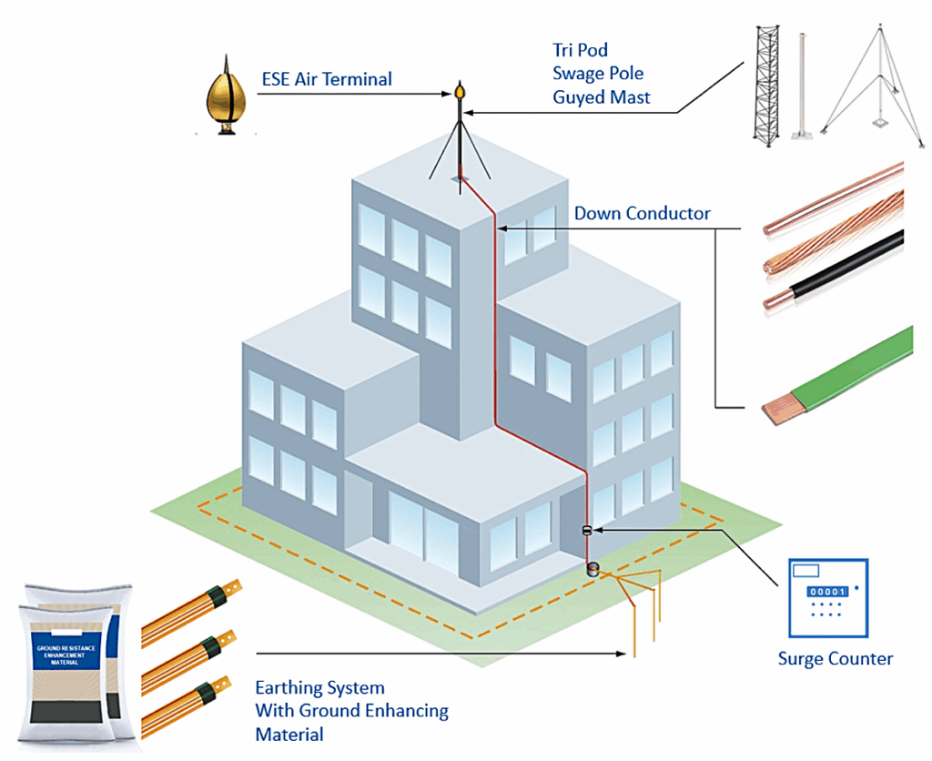 Precision-Engineered Air Terminals, Accessories, Down Conductors, and Earthing Solutions for Lightning Protection.